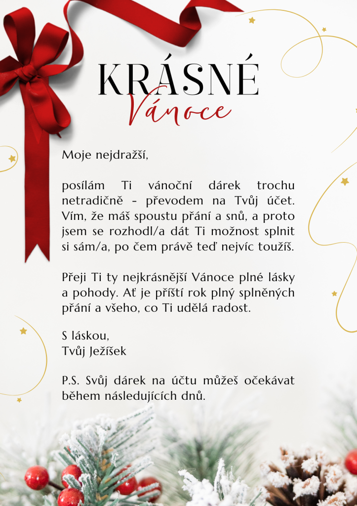 Překvapte své blízké originálním způsobem a spojte praktický finanční dar s duchem Vánoc. Potěšíte autentickým dopisem od Ježíška, to vše rychle, jednodušše a z pohodlí Vašeho domova.